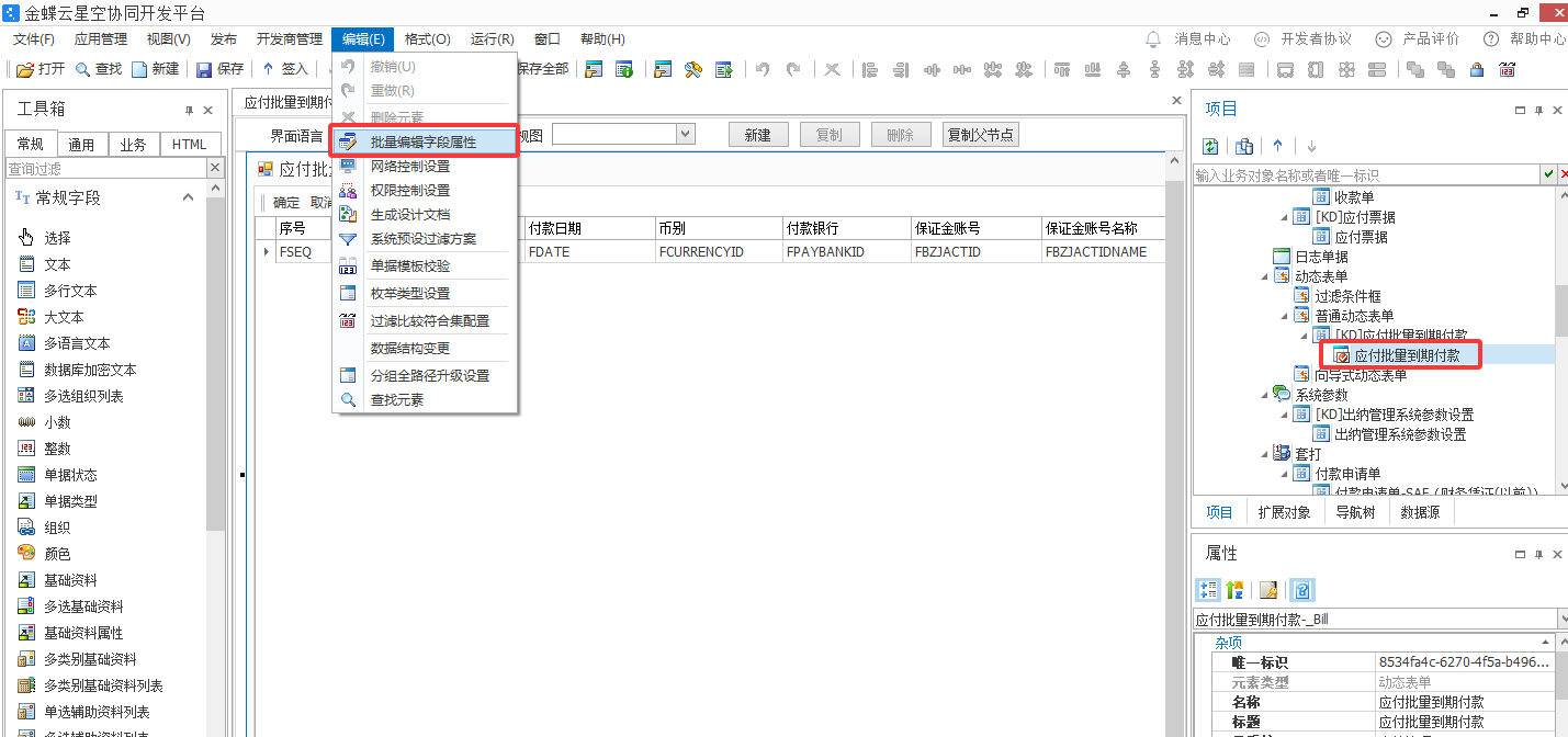 Step1、打开【应付批量到期付款】-【批量编辑字段属性】