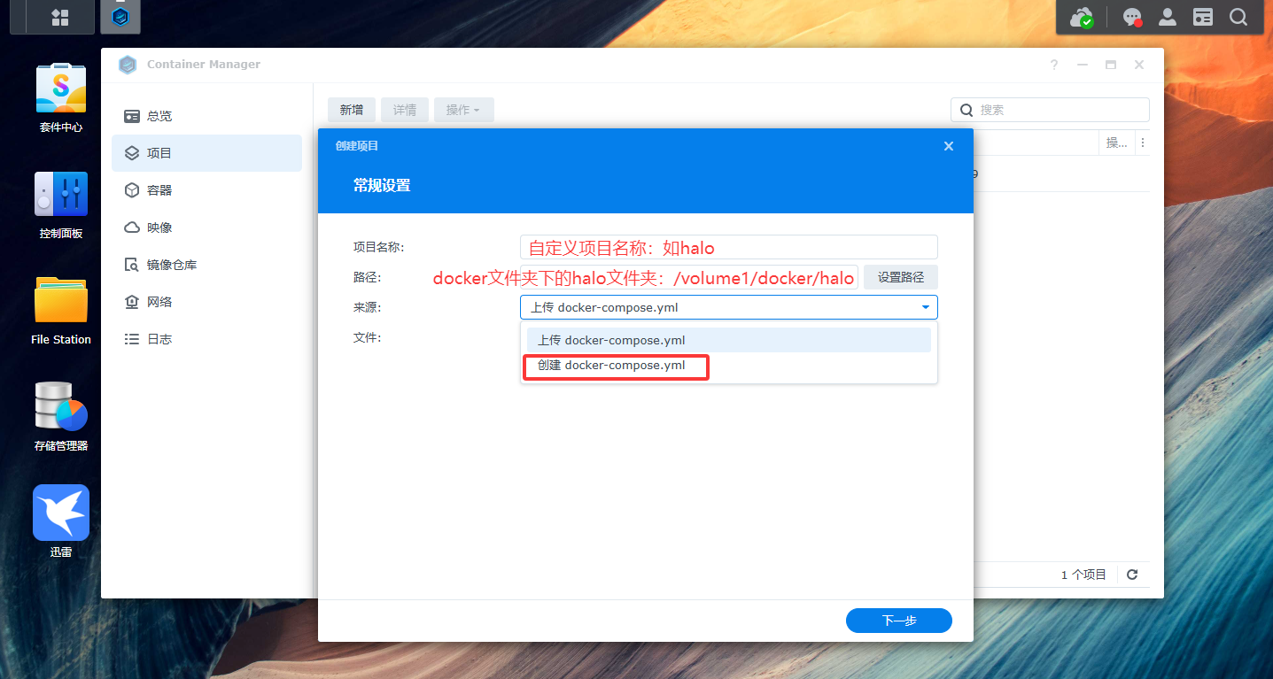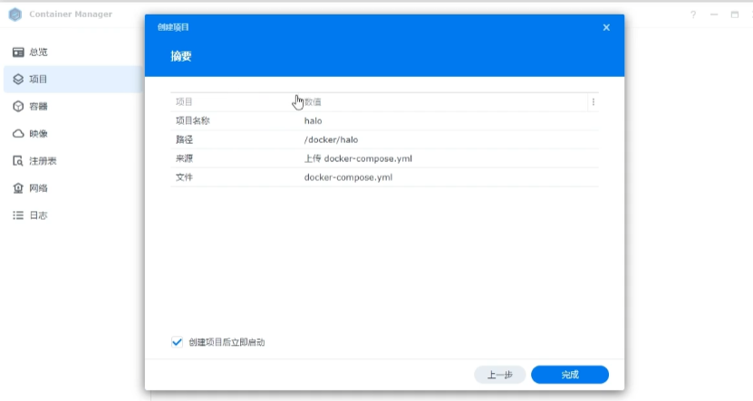 打开Container Manager,新增项目。此篇文章采用docker compose 一键生成halo+mysql容器的方式部署